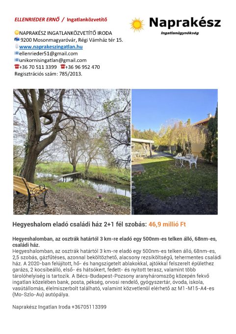 Hegyeshalomban, az osztrák határtól 3 km-re eladó egy 500nm-es telken álló, 68nm-es, 2,5 szobás, gázfűtéses, azonnal beköltözhető, alacsony rezsiköltségű, tehermentes családi ház. A 2020-ban felújított, hő- és hangszigetelt ablakokkal, ajtókkal felszerelt épülethez garázs, 2 kocsibeálló, első- és hátsókert, fedett- és nyitott terasz, valamint több tárolóhelyiség is tartozik.